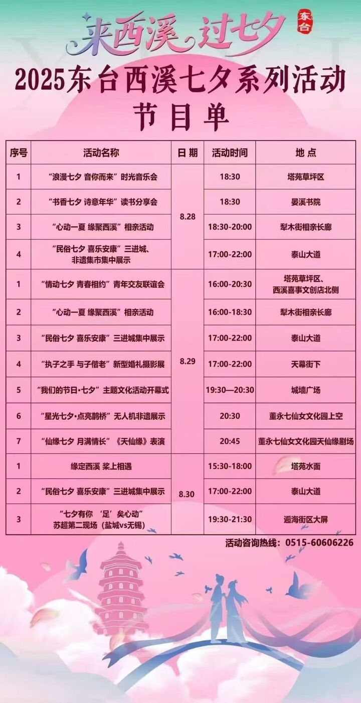 爱情恒久远,佳话永流传,董永传说也融入时代发展、谱写了传承新篇。近年来,东台市在西溪古镇围绕孝贤文化和爱情传说两大主题,设计建设了董永七仙女文化园。今年“我们的节日·七夕”主题文化活动期间,音乐会、读书会、相亲联谊会、新型婚礼摄影展、无人机表演等精品活动遍布东台全城,诠释“乞巧”内涵的东台发绣,和别出心裁的婚姻登记处,都是此次活动的亮点。